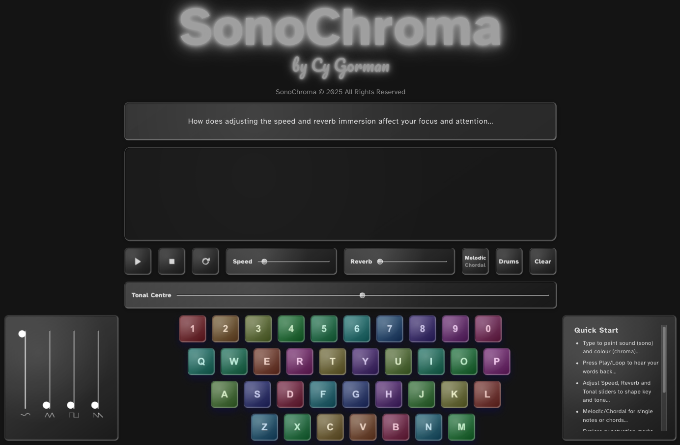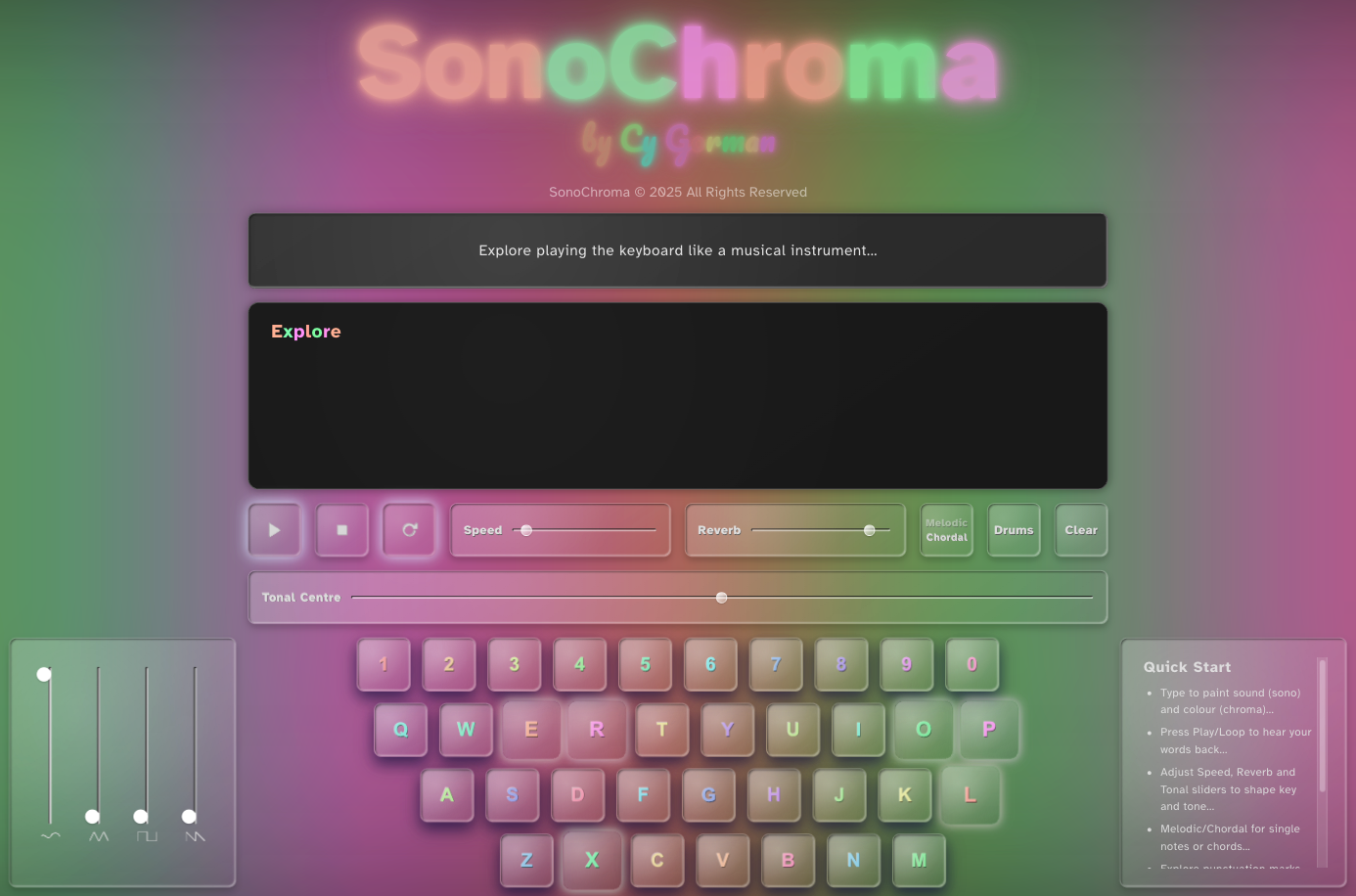 What if typing became music? What if words had colour? SonoChroma Keyboard is an interactive web-based application that transforms typed language into sonic and colored 'sonochromatic' expression. Each keystroke becomes both a character and a note—an act of real-time audiovisual composition. Words emerge as melodies and chords, with punctuation marks acting as percussive elements.
